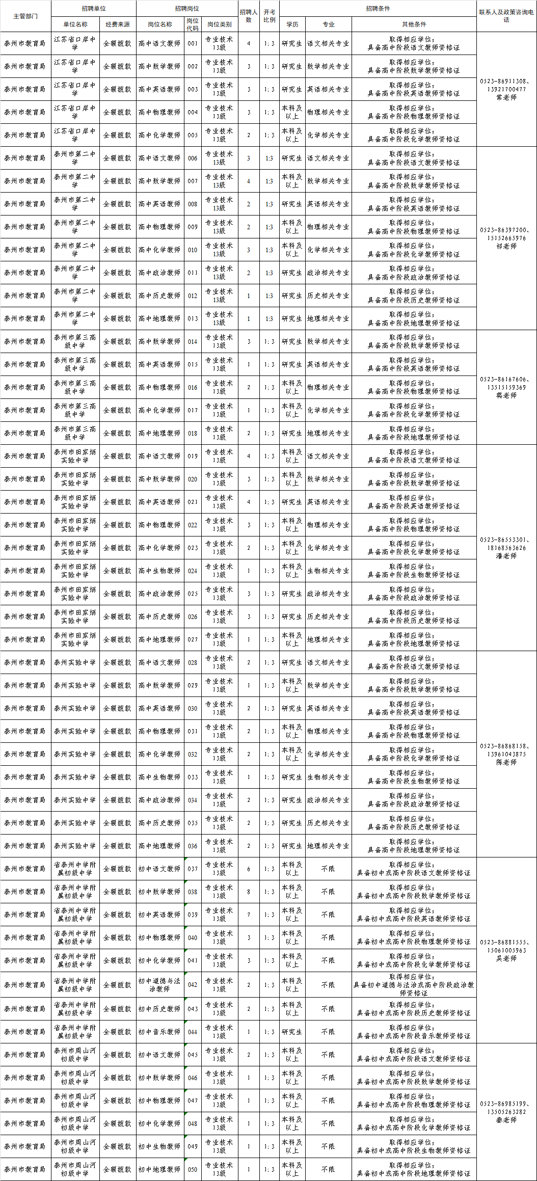 為進(jìn)一步加強(qiáng)教師隊伍建設(shè),根據(jù)《江蘇省事業(yè)單位公開招聘人員辦法》《關(guān)于進(jìn)一步做好全省中小學(xué)校新進(jìn)教師公開招聘工作的意見》《關(guān)于進(jìn)一步做好全市中小學(xué)教師公開招聘工作的通知》精神,泰州市教育局直屬學(xué)校將赴相關(guān)高校招聘全額撥款事業(yè)編制教師121名,F(xiàn)將有關(guān)事項公告如下: