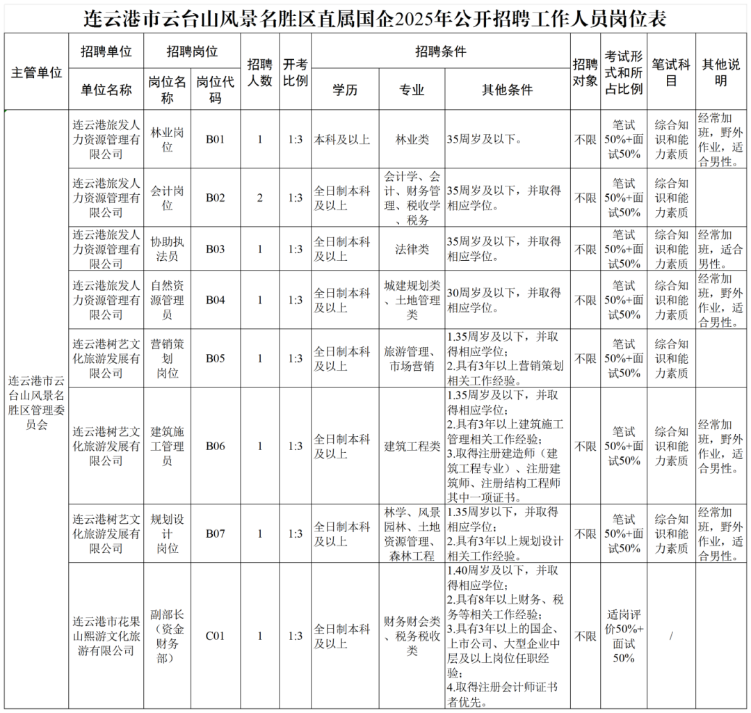 連云港市云臺山風景名勝區(qū)管理委員會直屬國企2025年公開招聘工作人員公告
