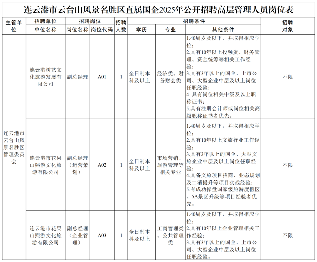 連云港市云臺山風景名勝區(qū)管理委員會直屬國企2025年公開招聘高層管理人員公告