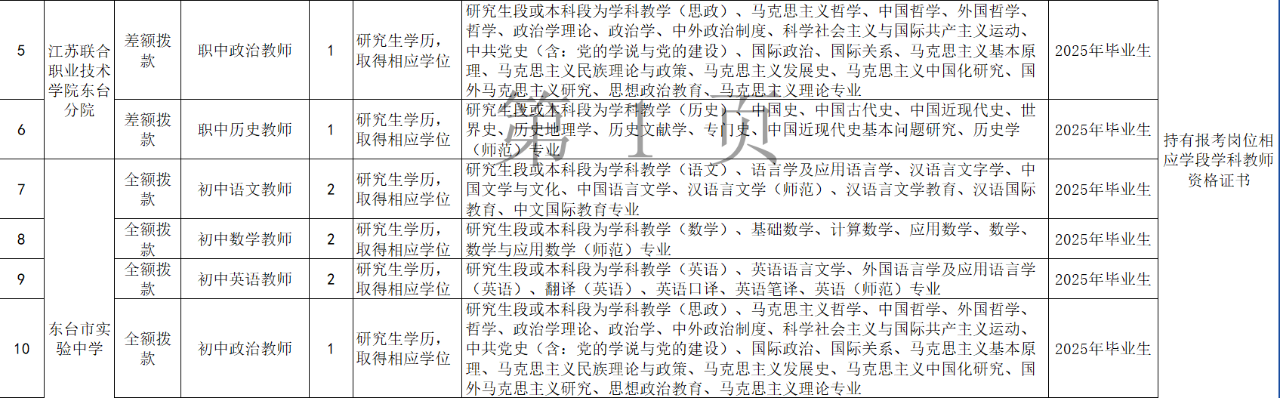 為貫徹落實人才強市戰(zhàn)略,江蘇省東臺中學、東臺市 中學、東臺市實驗中學、江蘇聯(lián)合職業(yè)技術(shù)學院東臺分院擬面向2025年畢業(yè)生公開招聘部分學科教師20名,F(xiàn)公告如下: