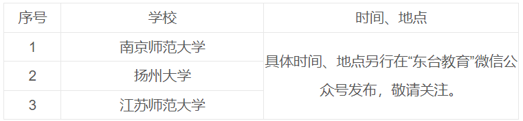 本次校園招聘擬于省內(nèi)部分高校設置報名點,由東臺市教育局組織相關(guān)學校進行宣講,宣講會后即組織現(xiàn)場報名。各院校宣講、報名具體時間、地點安排如下: