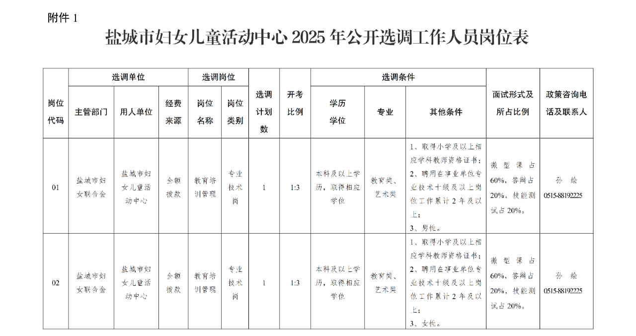 (1)《鹽城市婦女兒童活動中心2025年公開選調(diào)工作人員報名表》一式三份(附件2),報名表請到“鹽阜女性”微信公眾號或“鹽城市婦女兒童活動中心”微信公眾號下載。