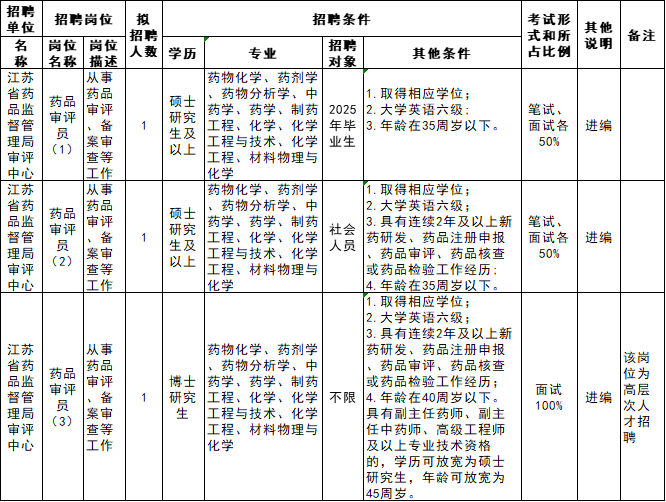 - 3人!事業(yè)編!江蘇省藥品監(jiān)督管理局審評(píng)中心2025年公開招聘工作人員公告