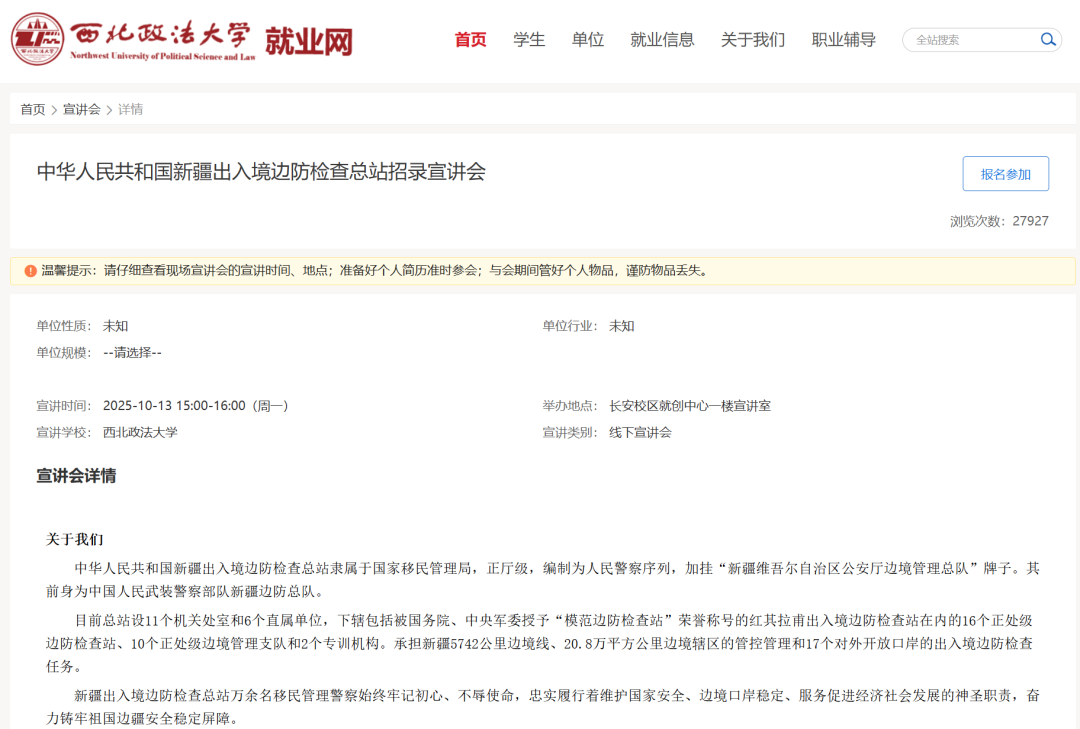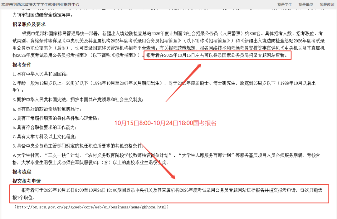 西北政法大學(xué)就業(yè)網(wǎng)官方發(fā)布關(guān)于「中華人民共和國新疆出入境邊防檢查總站招錄宣講會(huì)」中說明“報(bào)考者可于2025年10月15日8:00至10月24日18:00期間登錄中央機(jī)關(guān)及其直屬機(jī)構(gòu)2026年度考試錄用公務(wù)員專題網(wǎng)站進(jìn)行報(bào)名并提交報(bào)考申請,每次只能選報(bào)1個(gè)職位!一般出公告次日報(bào)名,10月14日出公告的消息幾乎是板上釘釘了!