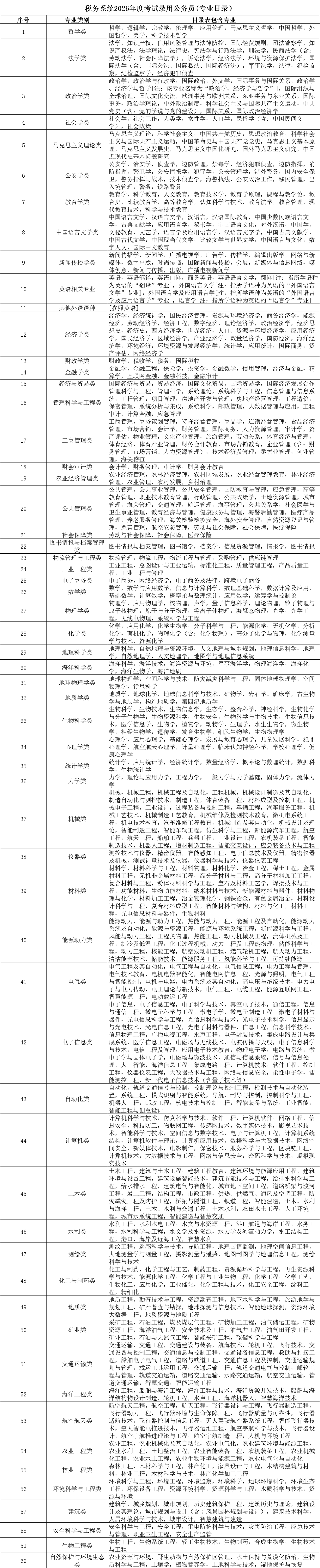 五、關(guān)于招考專業(yè)。根據(jù)2026年度稅務(wù)系統(tǒng)考錄公務(wù)員職位需求編制的專業(yè)參考目錄(見下表),包含了本科及以上學(xué)歷層次所需的相關(guān)專業(yè)。報考人員所學(xué)專業(yè)不在本表范圍內(nèi)的一般不接受報考,嘗試使用個別相近專業(yè)報考的,須如實準確填寫本人所學(xué)專業(yè)名稱及專業(yè)代碼,在“學(xué)科成績”或“備注”欄內(nèi)完整填寫該專業(yè)所有課程名稱和成績,并對所學(xué)專業(yè)進行簡要描述和說明,由招錄機關(guān)根據(jù)報考人員實際情況及用人單位人才需求,綜合進行資格審查。