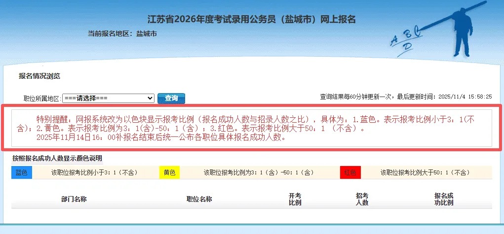 截至2025年11月6日16:00(報(bào)名第三天),鹽城全市共427個(gè)崗位變黃,2個(gè)崗位變紅。