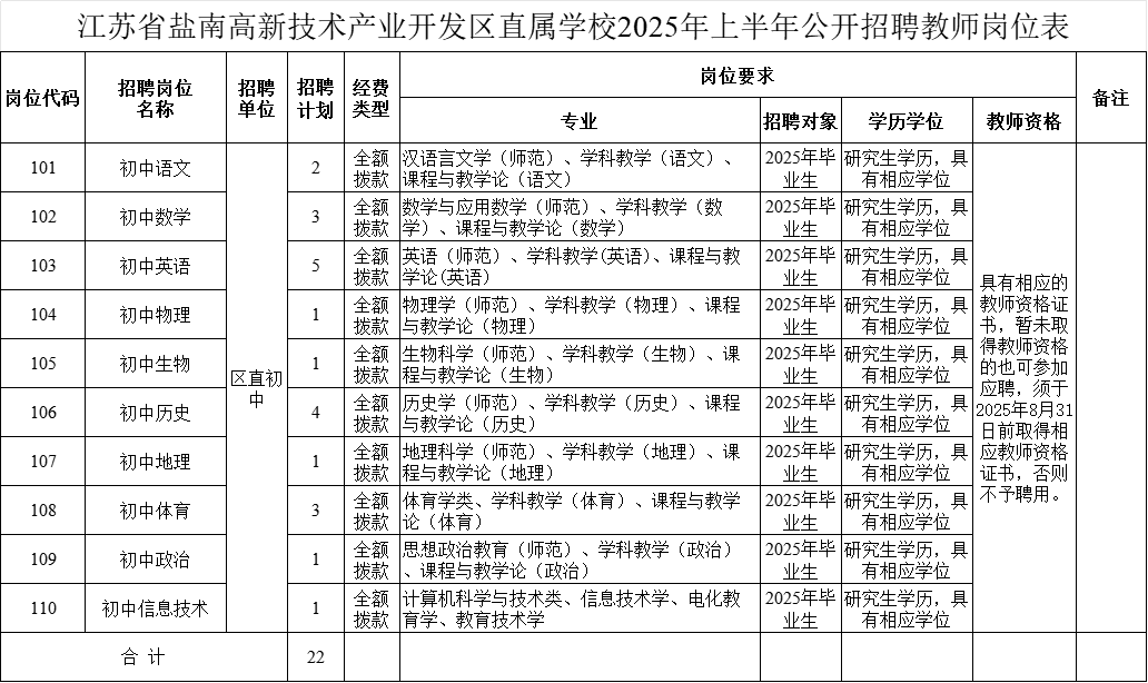 - 22人!教師編!鹽南高新區(qū)直屬學校2025年上半年公開招聘教師公告