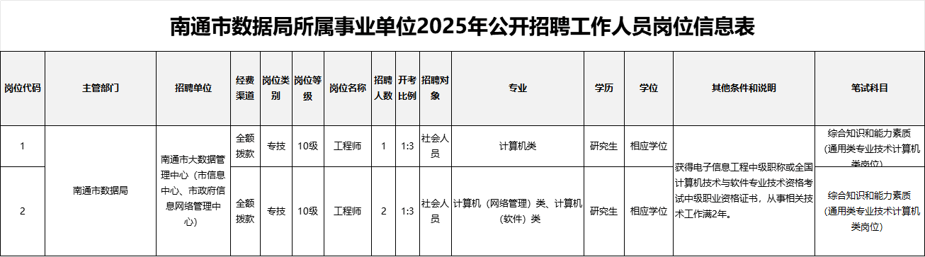 - 3人!事業(yè)編!南通市數(shù)據(jù)局所屬事業(yè)單位2025年公開招聘工作人員公告