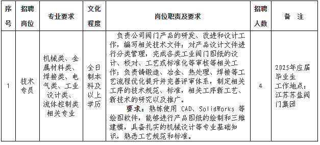 為助力民營(yíng)企業(yè)發(fā)展,加快石油化工產(chǎn)業(yè)鏈鏈主企業(yè)江蘇蘇鹽閥門集團(tuán)發(fā)展壯大,濱海城發(fā)投資控股集團(tuán)有限公司全資子公司濱?h產(chǎn)城融合工業(yè)發(fā)展有限公司(以下簡(jiǎn)稱產(chǎn)城融合公司)為蘇鹽閥門集團(tuán)面向社會(huì)公開招聘2025年應(yīng)屆專業(yè)人才4名,公司將保留相關(guān)錄用人員勞動(dòng)關(guān)系,錄用人員由蘇鹽閥門集團(tuán) 安排使用(服務(wù)期10年),現(xiàn)將有關(guān)事項(xiàng)公告如下: