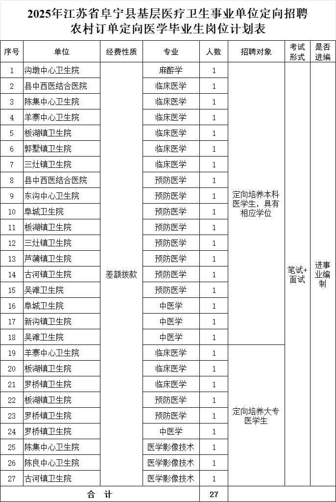 - 27人!醫(yī)療編!2025年江蘇省阜寧縣基層醫(yī)療衛(wèi)生事業(yè)單位定向招聘農(nóng)村訂單定向醫(yī)學(xué)畢業(yè)生通告