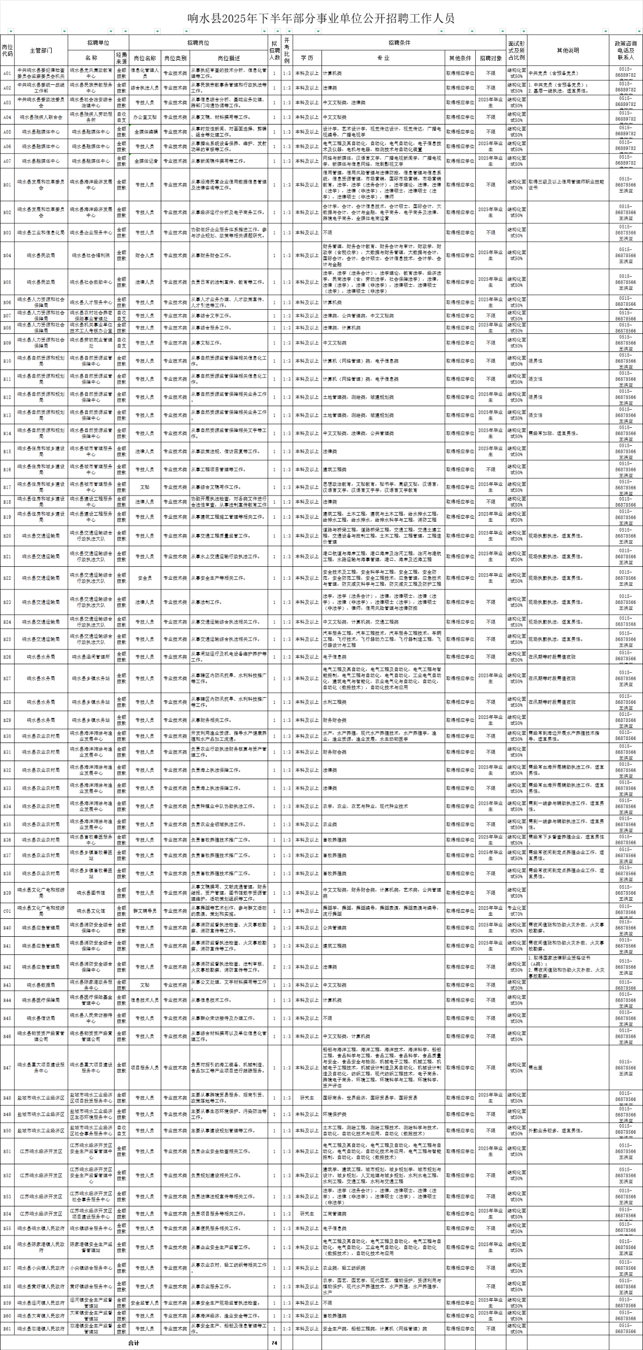 - 74人!事業(yè)編!響水縣2025年下半年部分事業(yè)單位公開招聘工作人員公告!