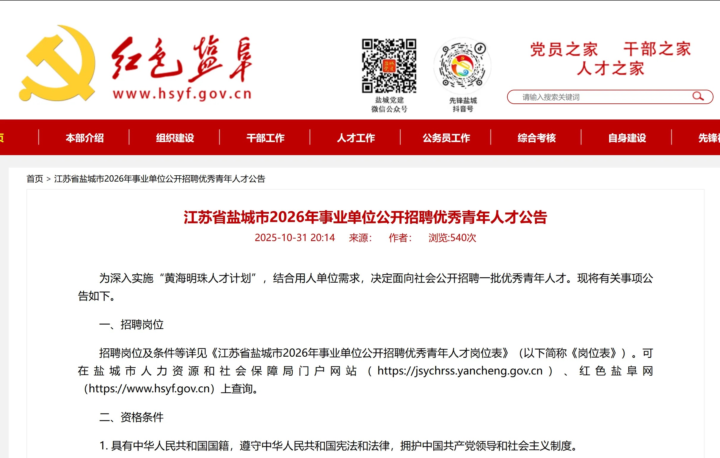 江蘇省鹽城市2026年事業(yè)單位公開招聘 青年人才公告(356人)(研究生學(xué)歷以上)(點擊此處跳轉(zhuǎn)至公告詳情)