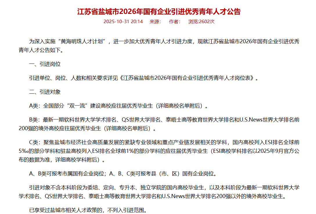 為深入實施“黃海明珠人才計劃”,進一步加大 青年人才引進力度,現(xiàn)就江蘇省鹽城市2026年國有企業(yè)引進 青年人才公告如下。